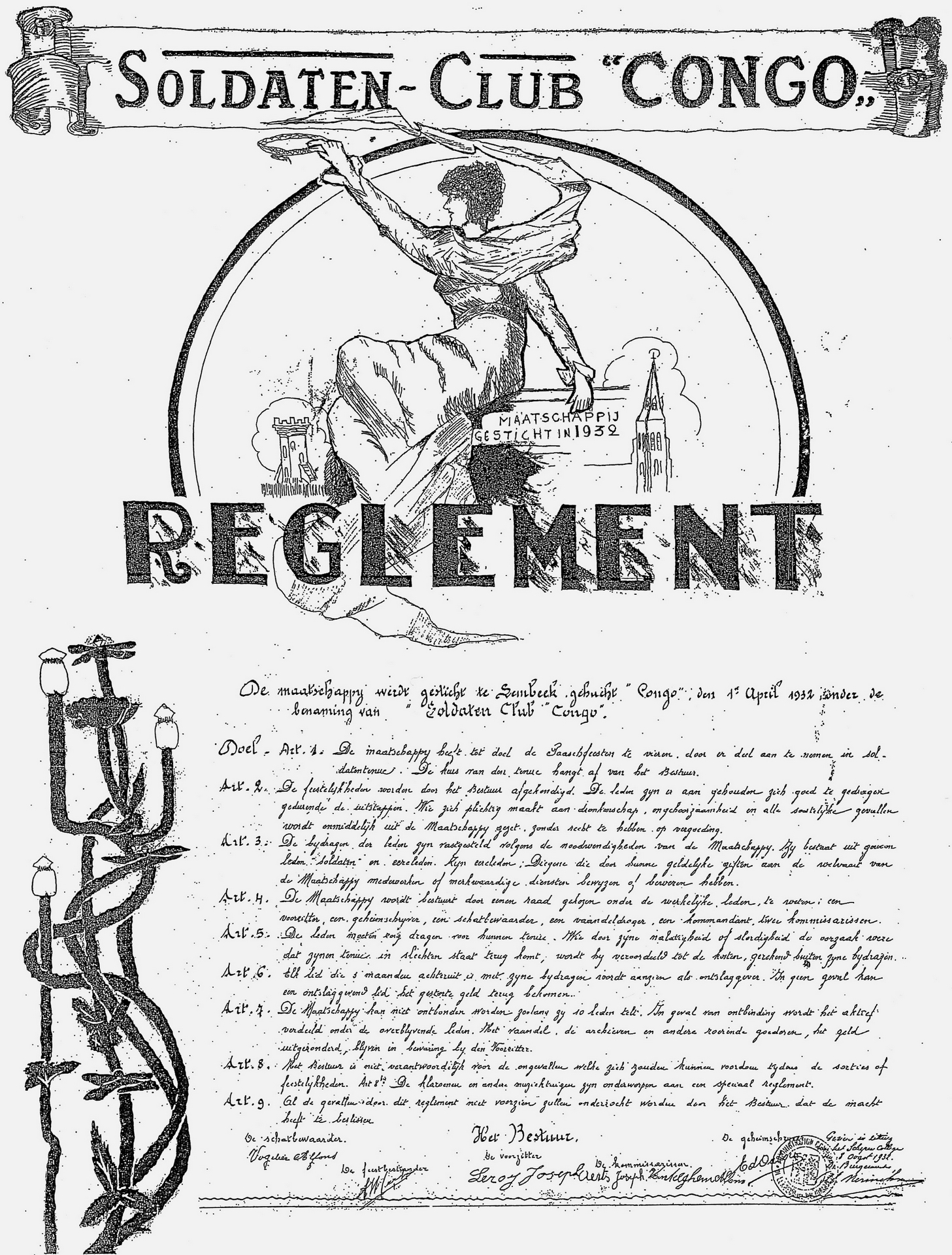 Het eerste logo (met de hand getekend) en het reglement van de Soldatenclub opgesteld door de oprichtiers